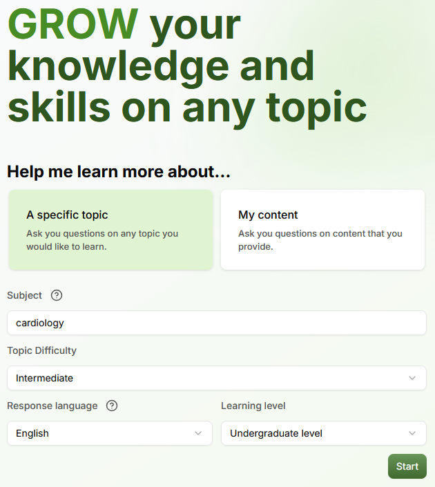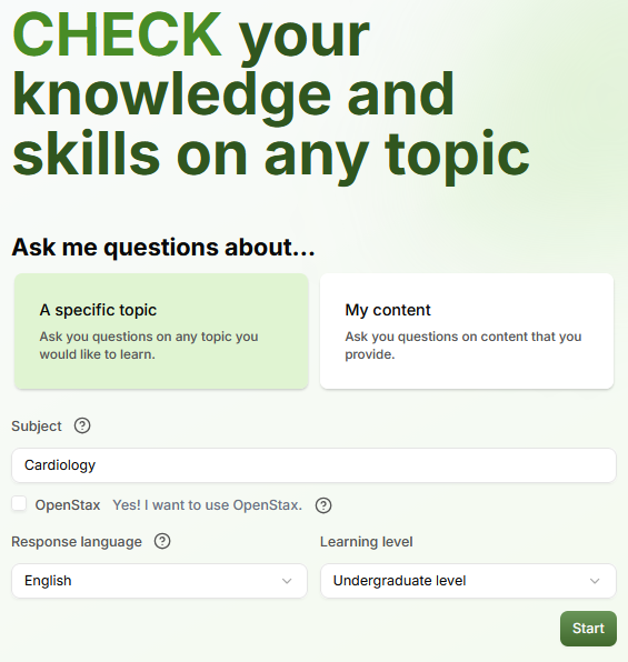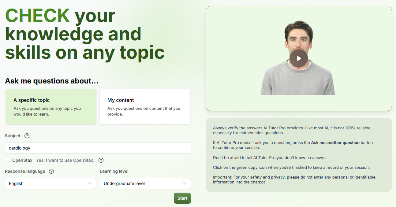 „AI Tutor Pro” besimokančiojo pasirinktai temai pateikia klausimus, iš besimokančiojo gauna atsakymus ir šis DI pateikia grįžtamąjį ryšį su atsakymo įvertinimu ir teisingo atsakymo paaiškinimu. Renkantis temą galima pasirinkti sunkumo lygį.