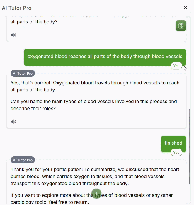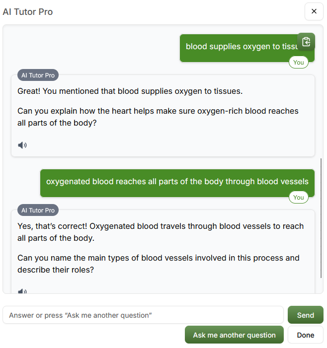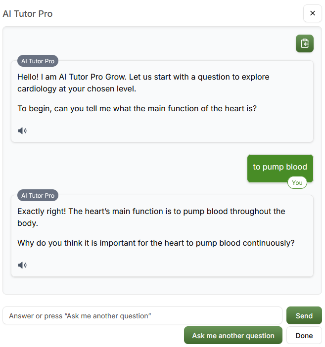 Atsidariusiame pokalbio lange DI pagal pasirinktą temą patekia pirma klausimą. Besimokantysis atsakymo laukelyje įrašo atsakymą ir spaudžia „Sent„. „AI Tutor Pro” pateikia grįžtamąjį ryšį su atsakumo įvertinimu ir teisingo atsakymo paaiškinimu. Ir pateikia sekantį klausimą iš tos pačios temos. Klausimo tekstą, paaiškinimą galima išklausyti.