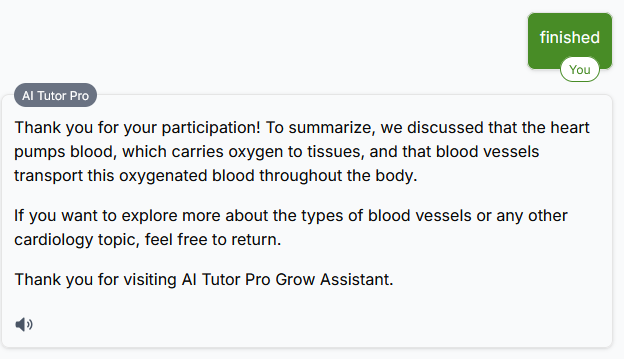 Baigiant pokalbį besimokantyssi spaudžia „Done„. DI pateikia pokalbio santraupą.Visą pokalbį galima nusikopijuoti.