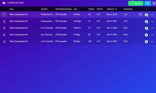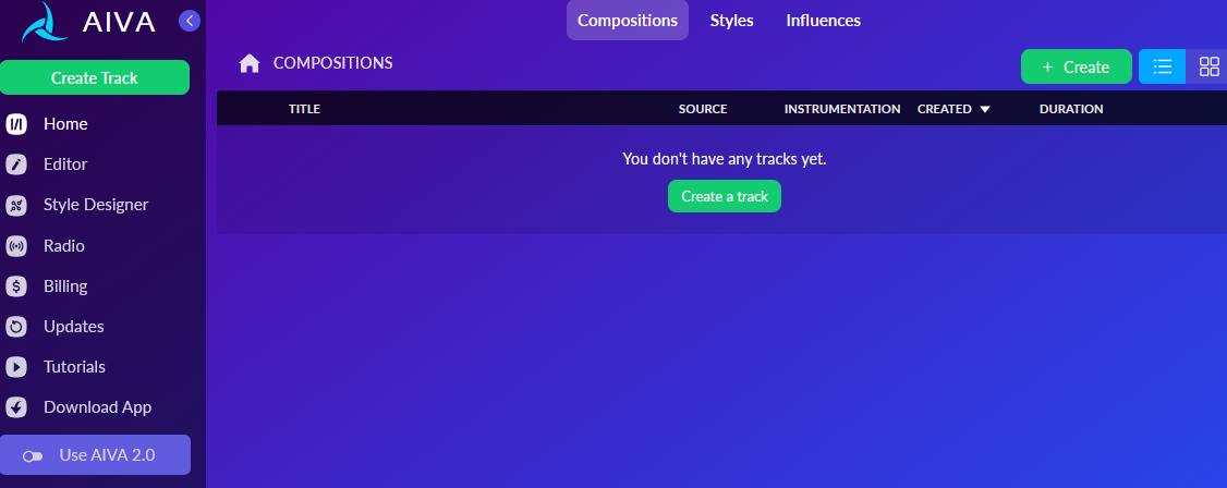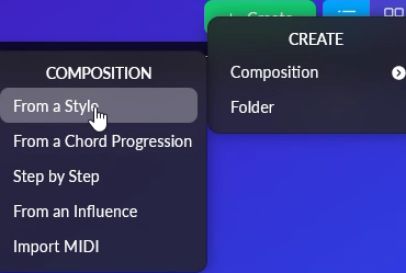 Prisijungus spauskite „Create”, pasirinkite iš kompozicijos, muzijos stiliaus ar katalogo norite generuoti muziką.