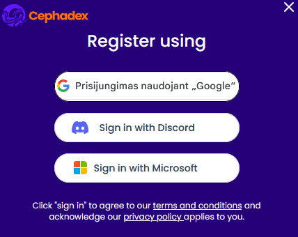 Prisijunkite Gmail, Microsoft ar Discord paskyra.