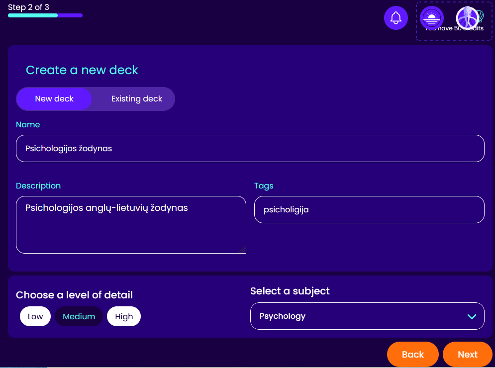 Įrašykite pavadinimą, aprašymą, žymą ir pasirinkite temos sritį.