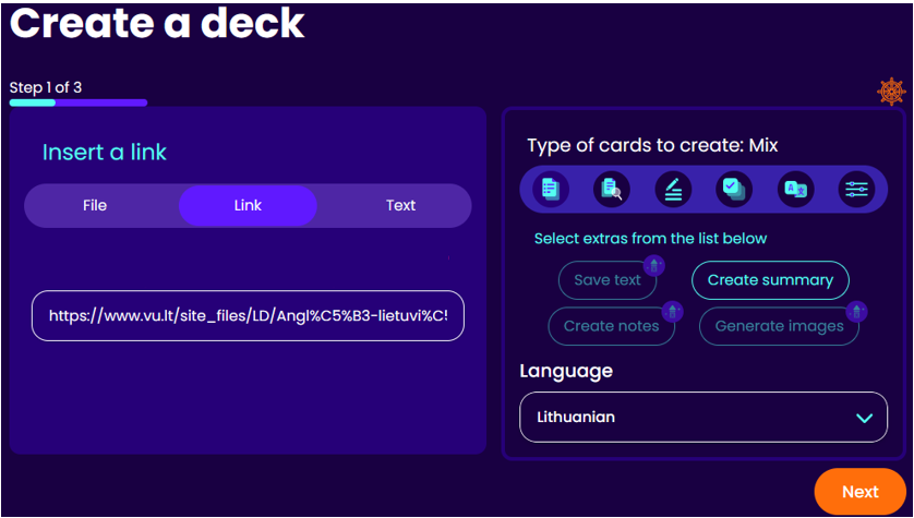 Įkelkite failą, įrašykite žiniatinklio nuorodą ar tekstą iš ko bus generuojamas turinys.