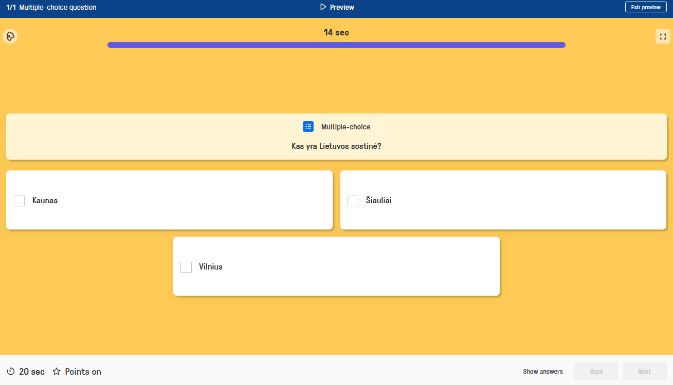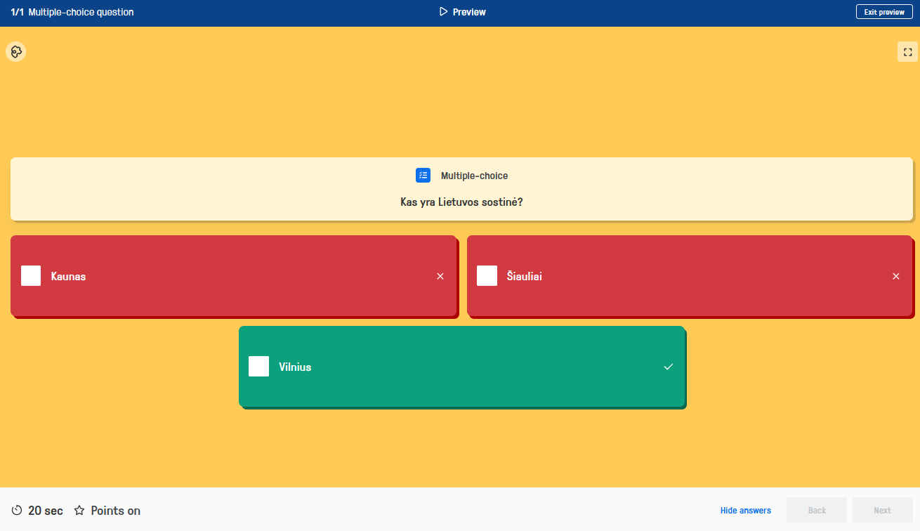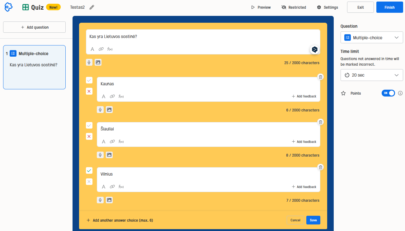 Pasirinkite skiltį „Klausimai“ (Questions), klausimo tipą „Keli pasirinkimo variantai“ (Multiple-choice question) ar „Atviras klausimas“ (Open-ended question).