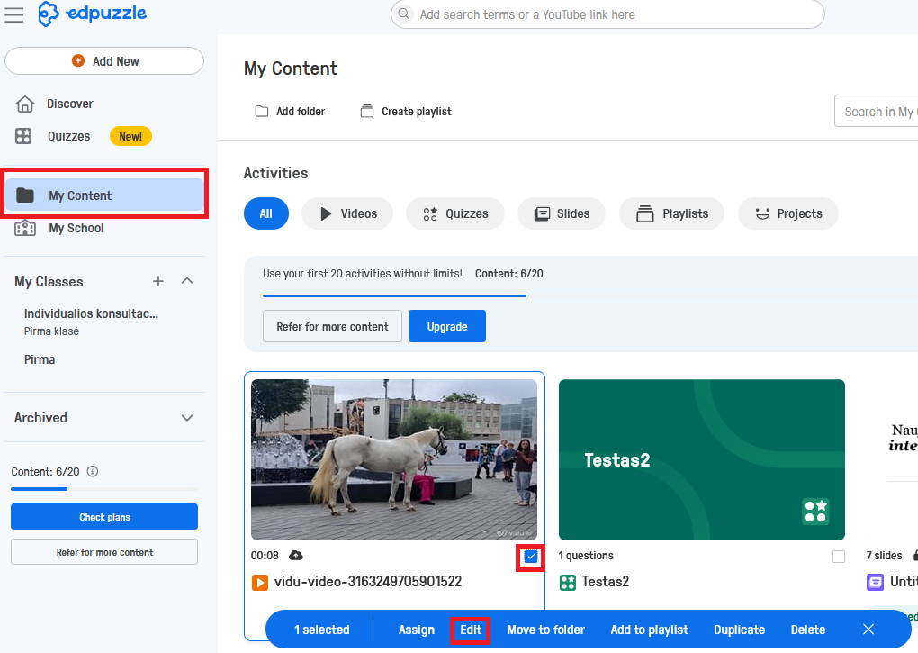Pasirinkus vaizdo įrašą, jis įkeliamas į „Ezpuzzle“ platformą į dėstytojo/pedagogo „Mano turinys“ (My Content) skiltį .
