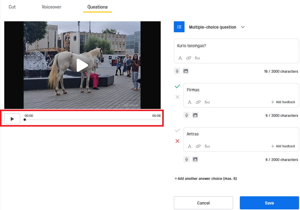 Pasirinkus klausimo tipą „Keli pasirinkimo variantai“, įveskite klausimą, atsakymus pažymint kuris/kurie teisingi, kurie neteisingi. Vaizdo įrašo „Laiko juostoje” (Time line) pažymėkite laiko vietą/vietas, kurioje bus vaizdo įrašas pristabdytas nustatytuose taškuose, kad būtų galima atsakyti į klausimus arba atlikti vaizdo įraše įterptus testus. Spauskite „Išsaugoti“ (Save) ir „Baigti“ (Finish).