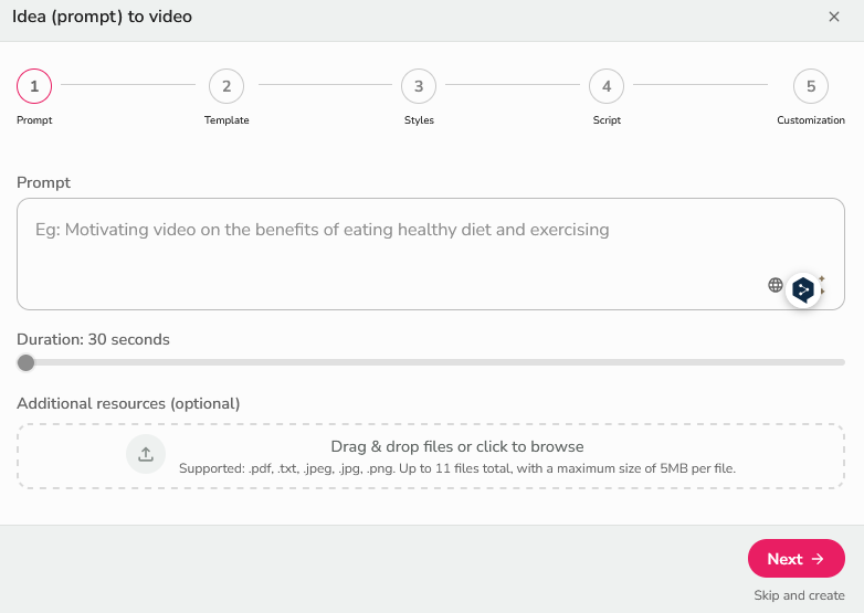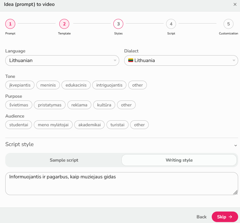 Pasirinkta kurti iš teksto (užklausos) interaktyvų turinį (Idea (prompt)).Įrašykite užklausos tekstą, pasirinkite šabloną, stilių, kalbą, skriptą.