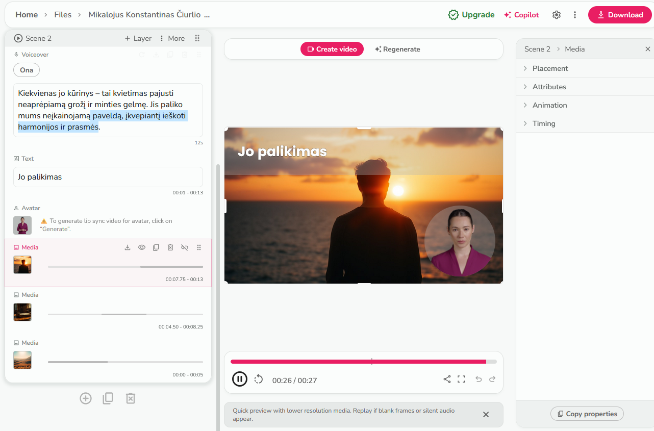 Suvedus nustatymus, parametrus, spauskite „Submit” ir bus sugeneruotas interaktyvus vaizdo įrašas su įgarsinimu.