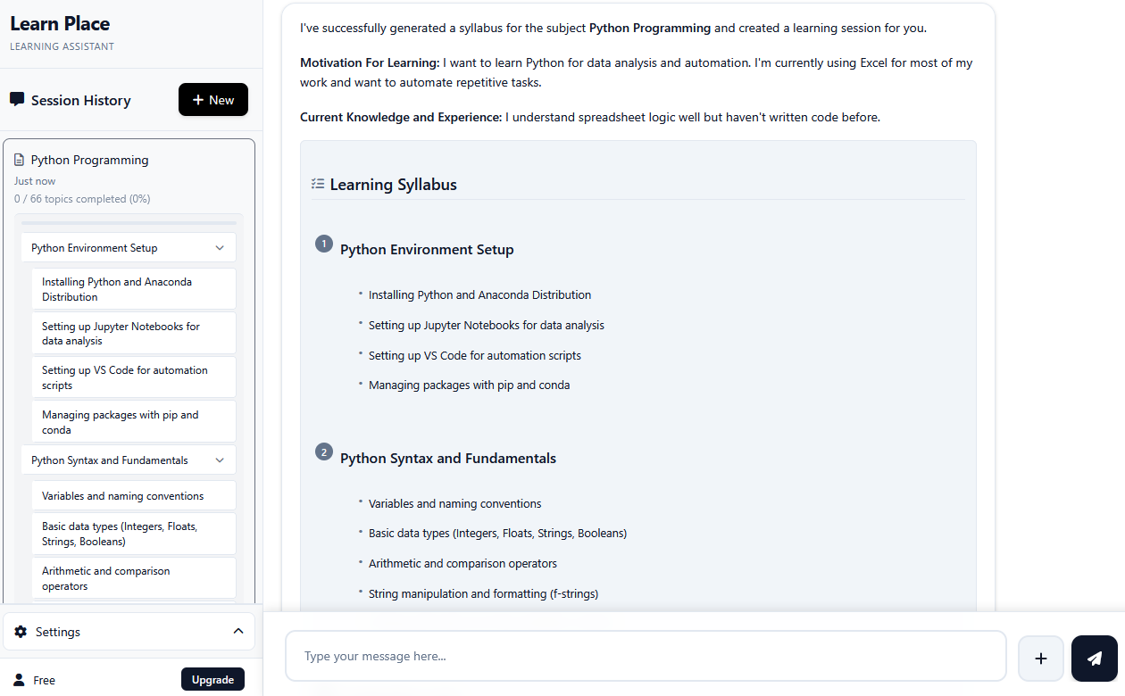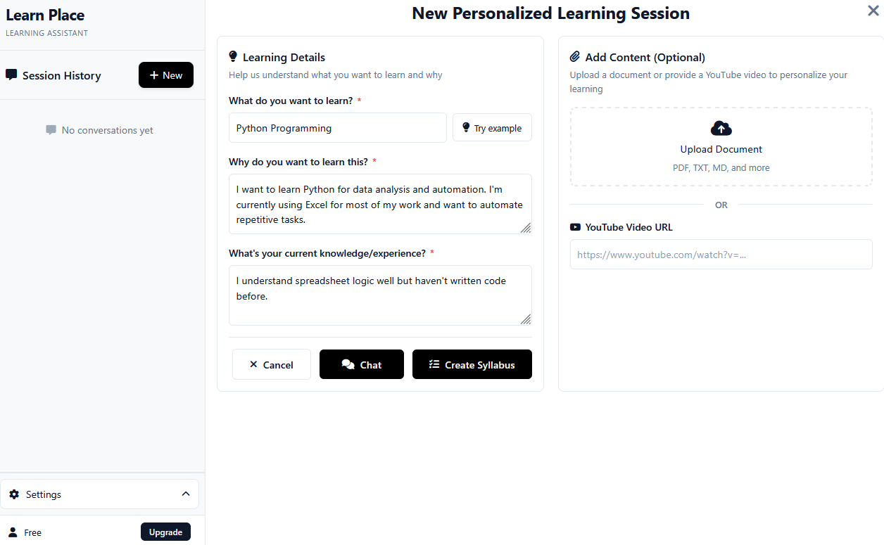 Įveskite kokia tema norite, kad būtų sukurta mokymo programa, kodėl norite mokymo proramos šia tema, kokia jūsų patirtis. Galima pateikti dokumentą ar youtube įrašo nuorodą. Ir spaukite „Create Syllabus”.