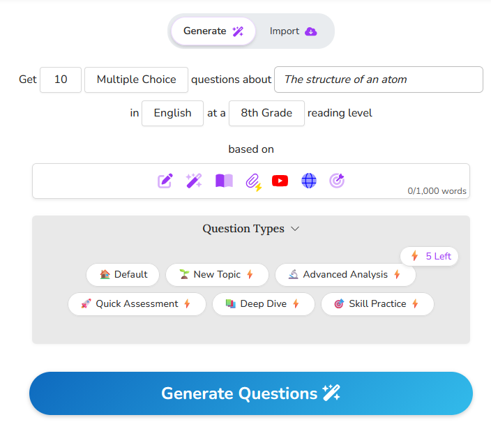 Pateikus mokomąją medžiagą, spauskite „Generate Questions”.