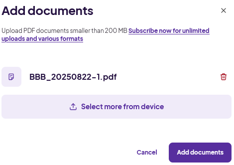 Pasirinkite failą, kurį norite įkelti ir spauskite „Add documents”.