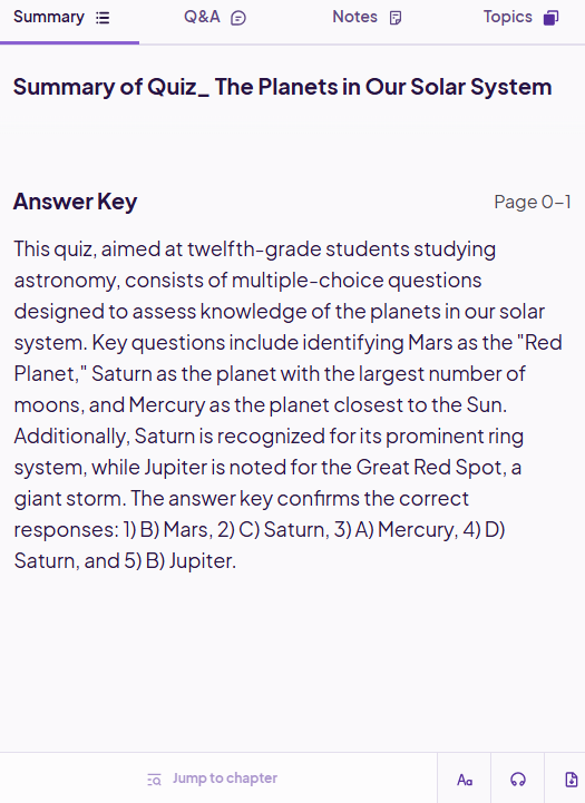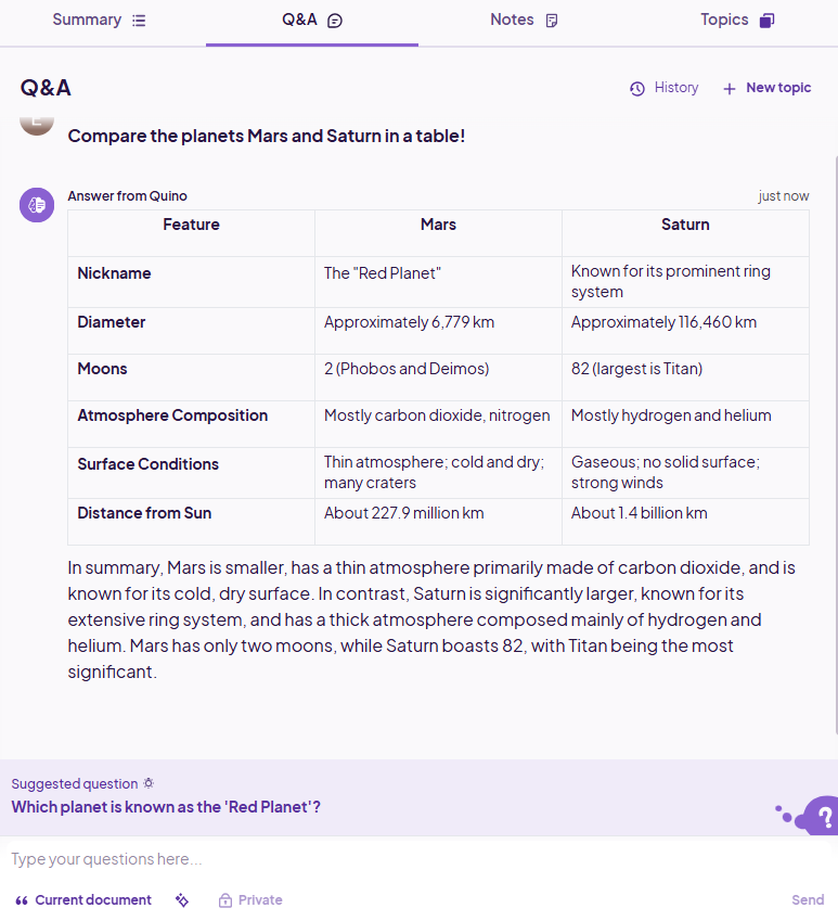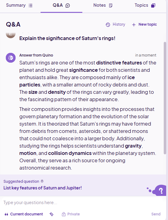Įkeltam dukumentui DI gali sugeneruoti santrauką, klausimus&atsakymus, temas.