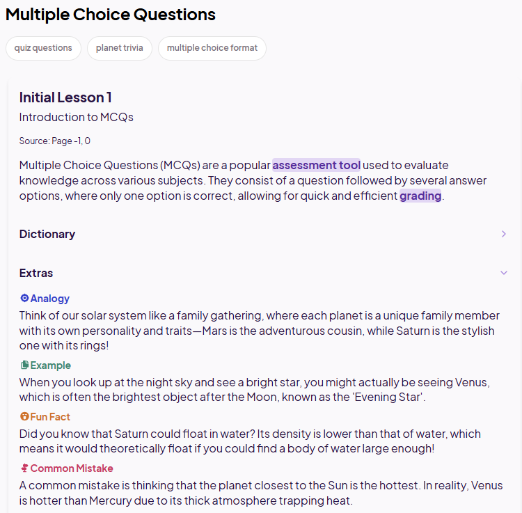 Dirbtinio intelekto pagrindu veikianti mokymosi platforma pirmiausiai skirta dėstytojams, norintiems automatizuoti kursų paruošimą ir didinti studentų įsitraukimą. Platformoje galima transformuoti akademinę medžiagą į interaktyvius mokymosi žaidimus. Įkėlus dokumentus, pristatymus ar vaizdo įrašus galima planuoti viso semestro veiklas, DI sistema automatiškai generuoja užsiėmimus, testus ir užduotis.