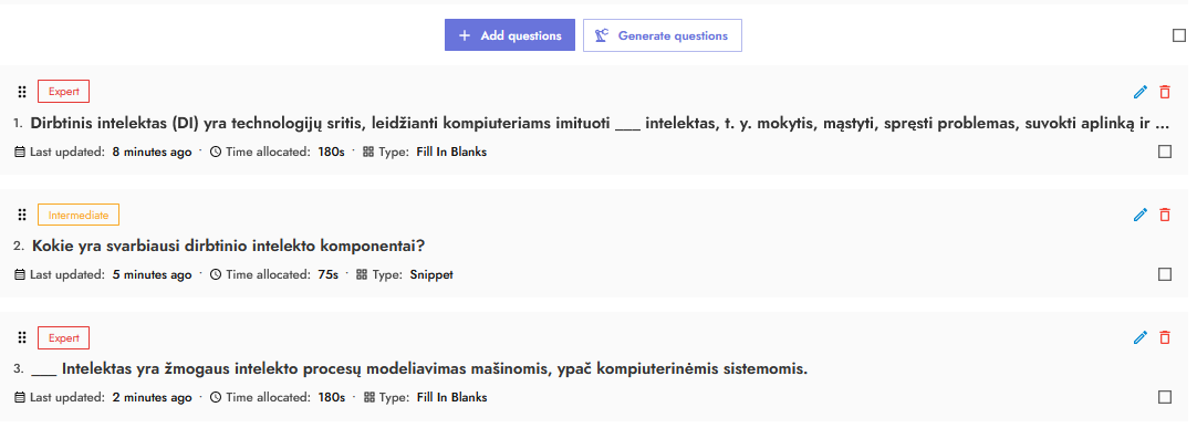 Pasirinkite ar pridėsite klausimus, ar bus generuojami.