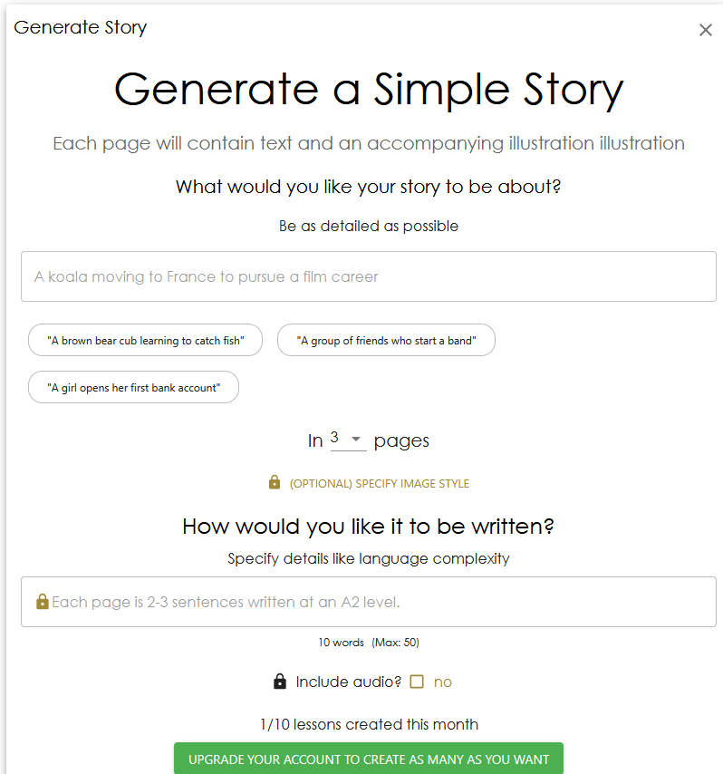 Pasirinkta generuoti iliustruotą istotiją „Generate an iliustrated story”.