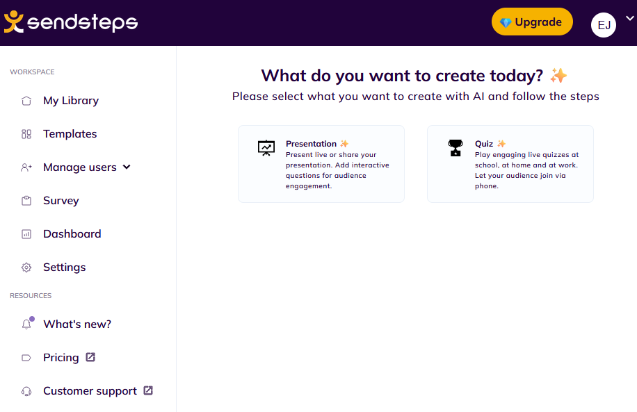 Pasirinkite ką norėsite su DI kurti ar prezentaciją, ar testą.