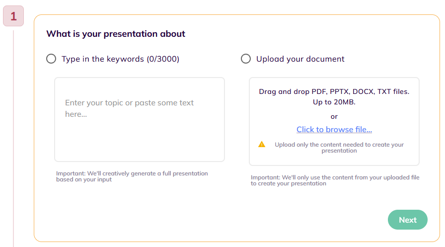 Pasirinkus kurti prezenraciją ,ją galima kurti iš įvesto teksto, ar iš pateikto dokumento.