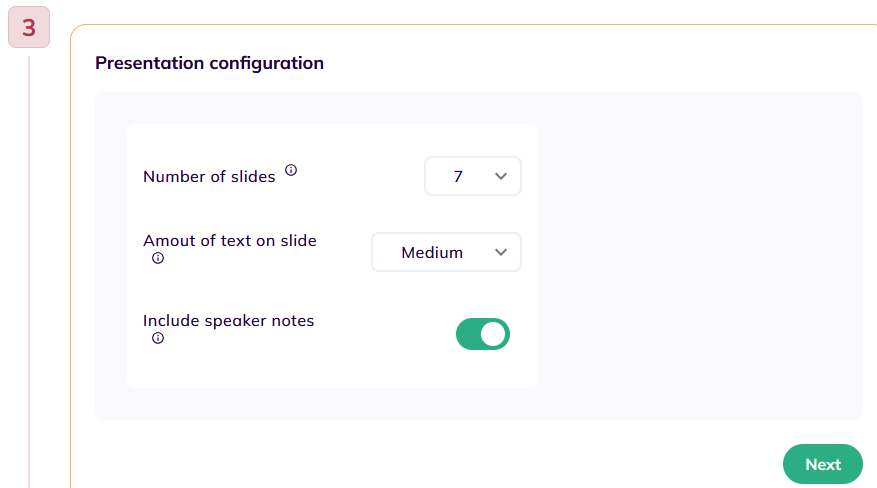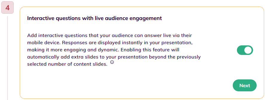 Pasirenkate kokia kalba bus prezentacija (lietuvių kalbos nėra), skaidrių skaičius, šrifto dydis, ar bus naudojami interaktyvūs klausimai, kokiai auditorijai prezentacija bus skirta, ar bus kuriamas planas.