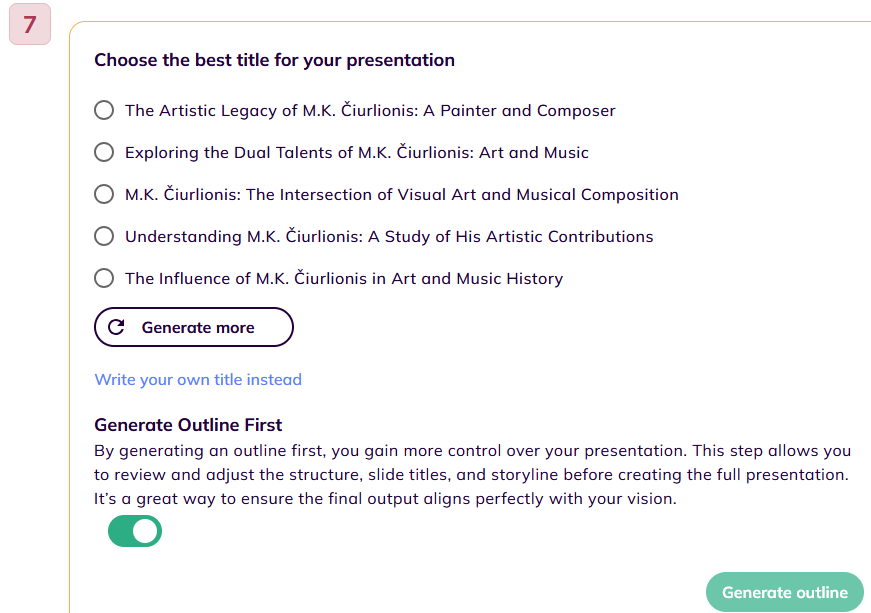 Pasirinkus prezentacijos nustatymus, pauskite „Generate presentation”.
