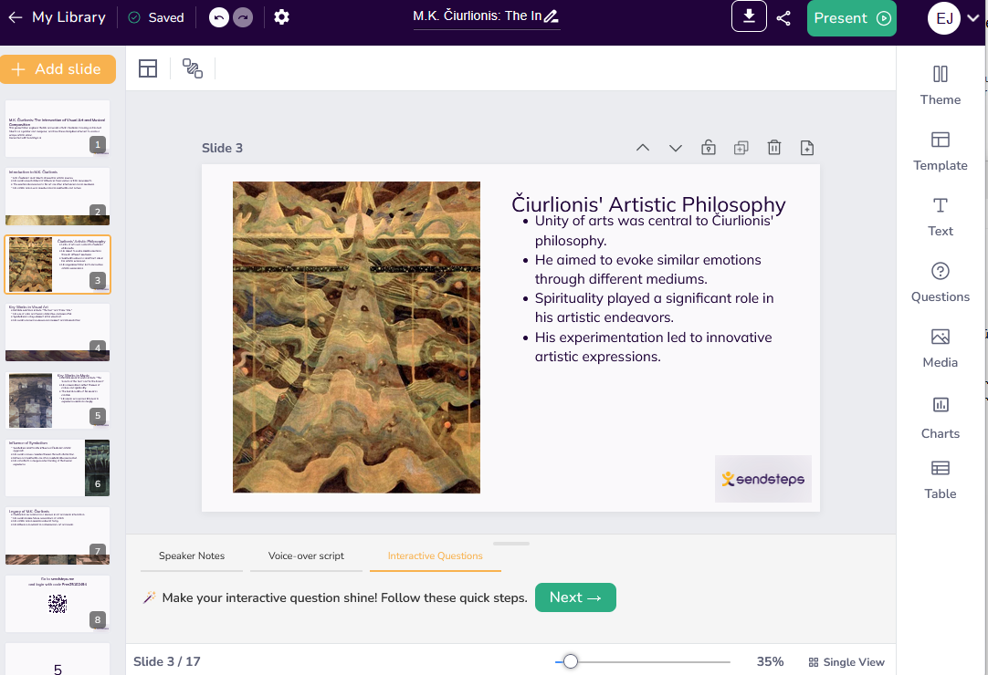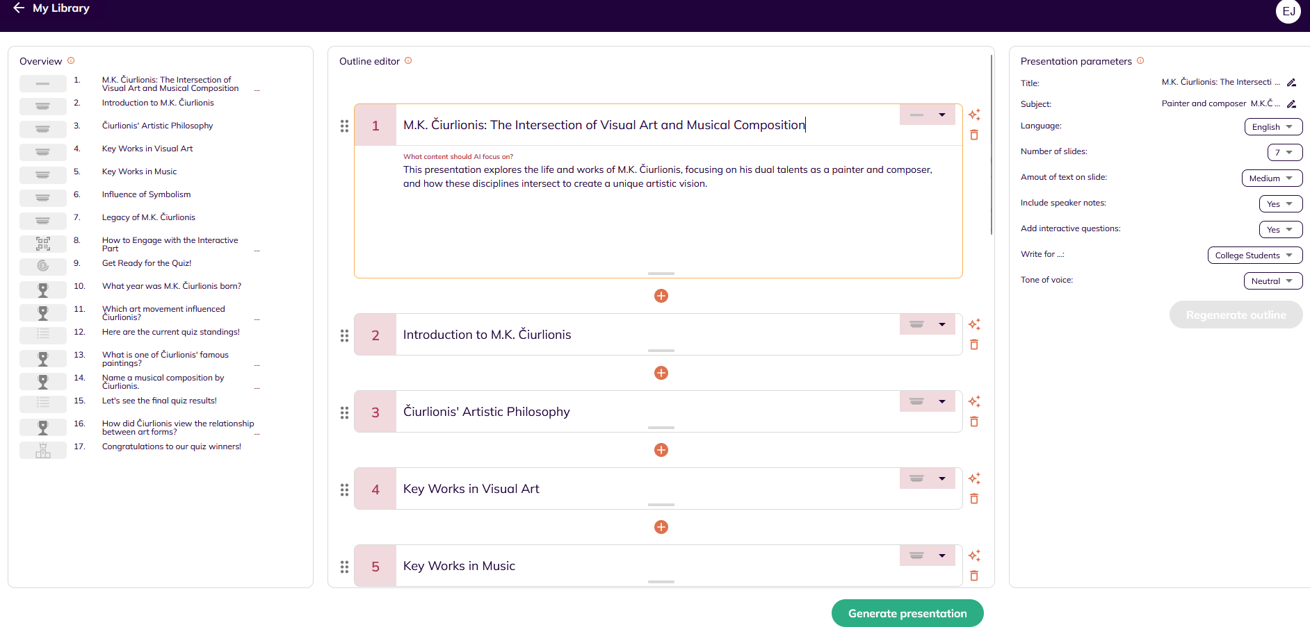Sugeneruotą prezentaciją galima pristatyti (nemokamas planas eksportuoti į ppt neleidžia).