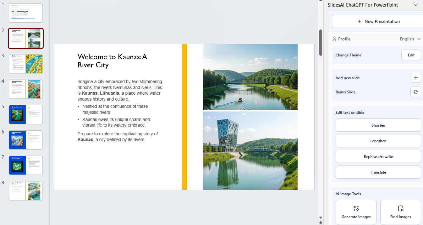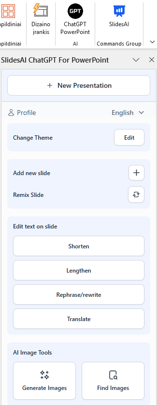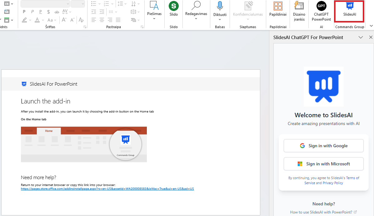 Įdiegtas PowerPoint įskiepis. Norint naudoti SlidesAI, prisijunkite Gmail ar Microsoft paskyra.