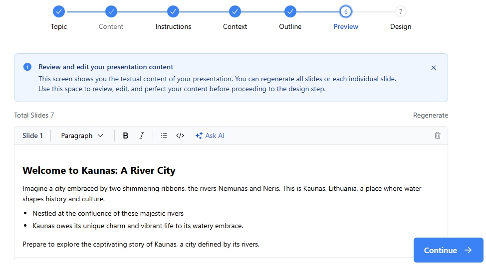 Parinkus skaidrių dizainą, spauskite „Generate Slides”.