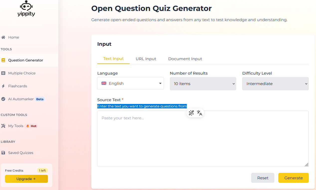 Įveskite tekstą ar pateikite nuorodą, dokumentą iš kurio bus generuojamas testas ir spauskite „Generate”.