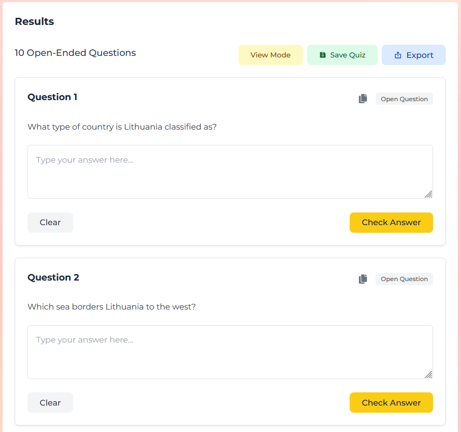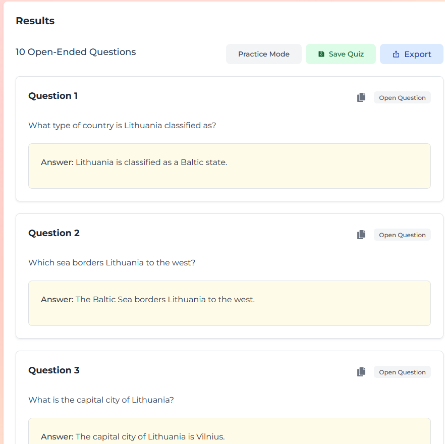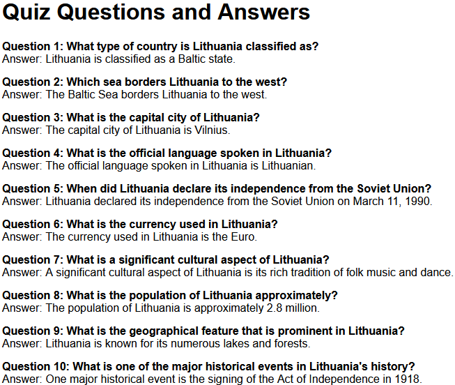 Į klausimą „What is Lithuania?” sugeneruotas testas.